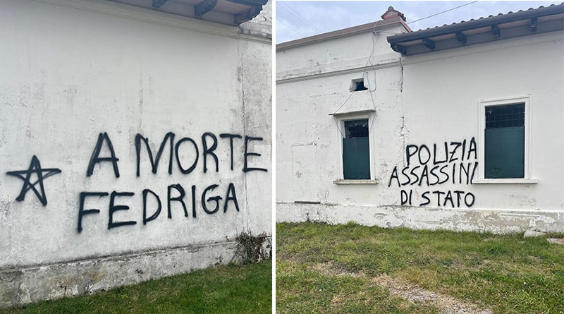 Minacce al presidente della Regione Massimiliano Fedriga e ingiurie alla Polizia sono comparse sui muri della struttura dell’ex tiro a segno di Osoppo.