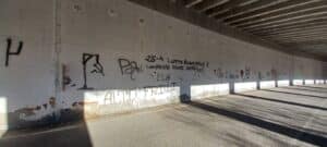 Tra i graffiti a bomboletta nera c’è il patibolo di un impiccato con appesi falce e martello, ma anche ‘88’ per “HH”, o “Heil Hitler”, sopra un “Dux” a caratteri maiuscoli e dentro un fascio littorio stilizzato. Sopra di tutto campeggia una scritta: “25 aprile lutto nazionale”, in riferimento alla fucilazione di Mussolini. Sotto: “Compagni, rigate dritto”.