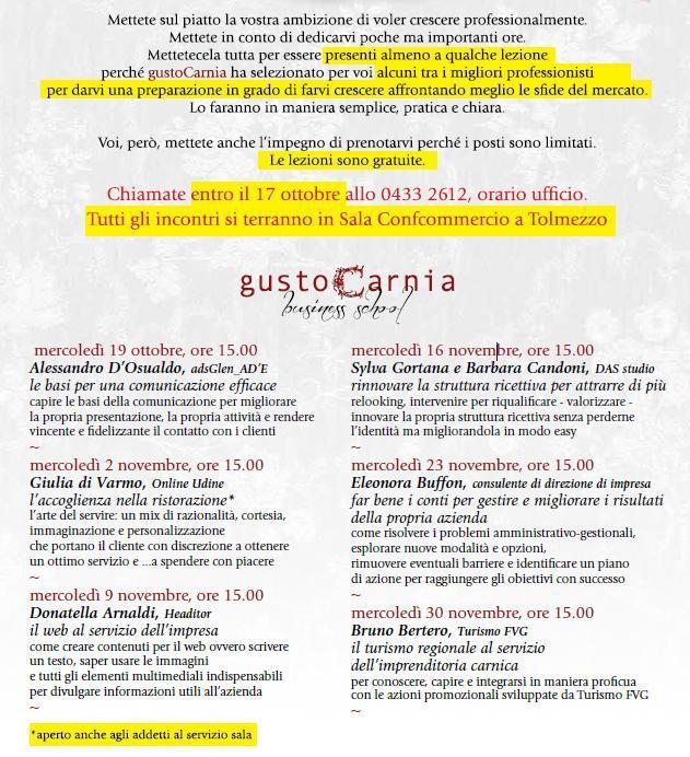 Confcommercio Udine, in collaborazione con “gustoCarnia” e “il Filo dei Sapori“, propone dei pomeriggi formativi organizzati per far crescere professionalmente ed economicamente gli albergatori e i ristoratori.