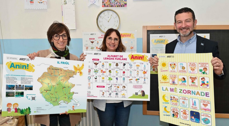Alle scuole dell’infanzia è stato recapitato il poster “La mê zornade“, che aiuta i bambini a ricordare le fasi della giornata e le attività quotidiane, come i pasti, l’igiene, il gioco, eccetera. L'”Alfabet de lenghe furlane” sarà invece appeso nelle aule delle classi 1ª e 2ª della scuola primaria, aiutando i piccoli a imparare a leggere e scrivere l’alfabeto e i digrammi della lingua friulana.