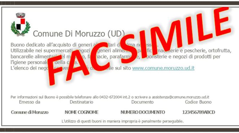 Il Comune di Moruzzo, con una delibera di giunta, ha stabilito le modalità di distribuzione dei buoni spesa. Si tratta fondi per 13.190,29 euro che, con ordinanza del Dipartimento della Protezione Civile del 29 marzo scorso, il governo ha stanziato ai Comuni per le misure urgenti di solidarietà alimentare per chi è rimasto senza lavoro e senza reddito.
