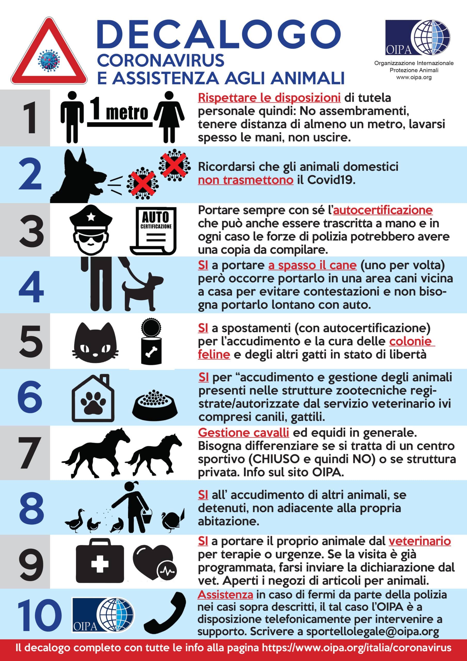 L’OIPA (Organizzazione Internazionale Protezione Animali) si mette in prima linea per diffondere un decalogo, in continuo aggiornamento sulla base dell’attuazione di nuove disposizioni, volto a sottolineare gli atteggiamenti corretti da adottare e alle condotte puntuali da seguire per la cura e l’assistenza agli animali.