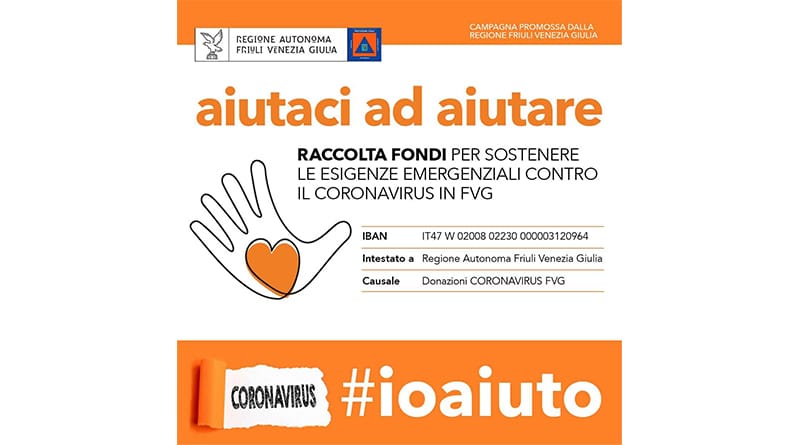 Per aderire alla campagna “Aiutaci a aiutare”, promossa dalla Regione, è possibile versare una quota sul conto della Regione Autonoma Friuli Venezia Giulia, Iban IT47 W 02008 02230 000003120964 e causale “donazioni CORONAVIRUS FVG”.