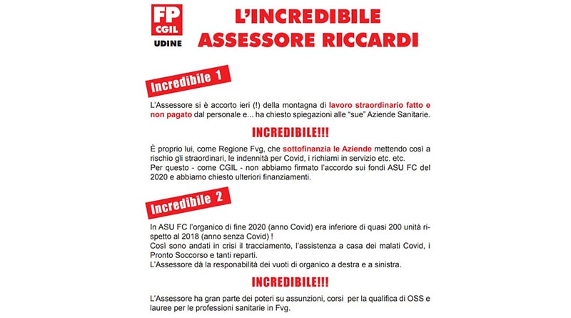 «Gli straordinari e le integrazioni Covid non pagati? Le responsabilità sono innanzitutto della Regione, e il fatto che l’assessore Riccardi le scarichi interamente sulle singole aziende è semplicemente incredibile». È quanto dichiara Andrea Traunero, segretario della Funzione pubblica Cgil Udine, spiegando le ragioni della campagna di volantinaggio (QUI IL VOLANTINO) che il sindacato Cgil della sanità promuoverà a partire da domani (25 marzo) tra il personale dell’Asufc. «È la Regione – spiega Traunero – a sottofinanziare le aziende. Prova ne sia che la proposta di accordo sulle premialità 2020 che ci aveva presentato l’Asufc a fine dicembre: quel documento, in premessa, definiva esplicitamente le risorse aggiuntive stanziate dalla Regione insufficienti a garantire le integrazioni salariali per la seconda ondata Covid. È proprio per questo motivo che la Cgil decise, responsabilmente, di non firmare quell’accordo e di segnalarlo alla Regione. Sentire l’assessore chiamarsi fuori e chiedere spiegazioni alle aziende è francamente sconcertante».