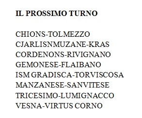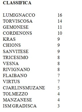 TOLMEZZO: Nardoni, Faleschini (12’st Leonetti), Zuliani, Iuri, Muffato, Scarsini, Falcon (12’st Fabris), Topazzini, Cucchiaro, Gregorutti, Ciotola (25′ Capellari). All. Fabrizio Damiani