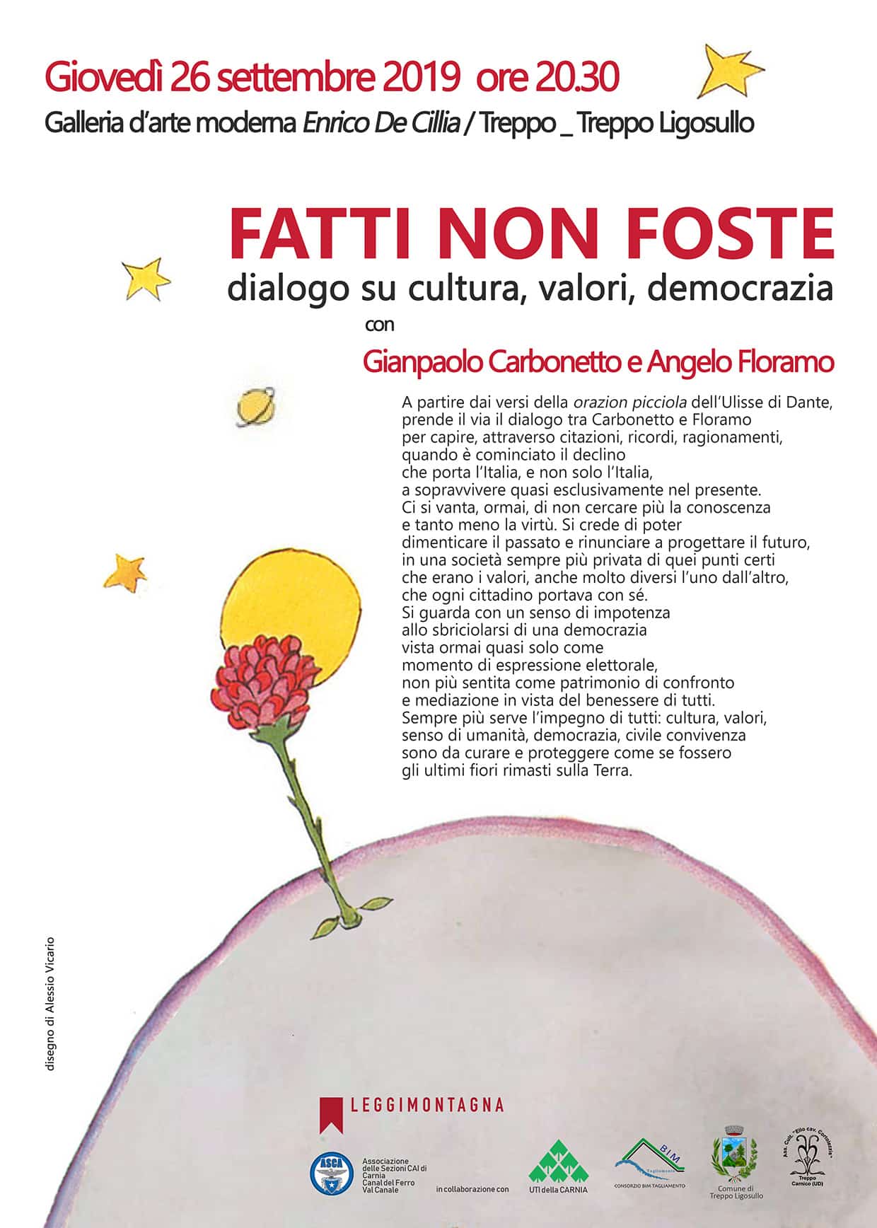 L’Associazione culturale “Elio cav. Cortolezzis”, che collabora all’evento culturale organizzato da Leggimontagna, invita giovedì 26 settembre alle 20.30, presso la Galleria d’Arte Moderna “Enrico De Cillia” di Treppo Ligosullo (nella foto di copertina), all’incontro dal titolo “Fatti non foste: dialogo su cultura, valori e democrazia”.