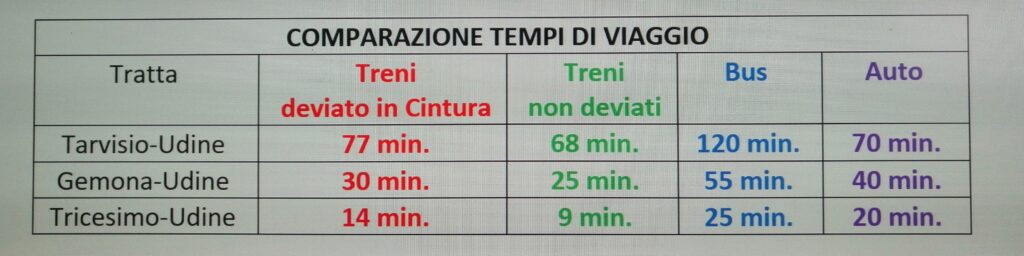 Da ciò emerge che è possibile modificare l’orario per i treni deviati, tornando ai tempi di percorrenza pre-sperimentazione, sterilizzando gli aumenti di percorrenza della Cintura, grazie alle riduzioni di percorrenza lungo la relazione Tricesimo-Carnia-Tarvisio;