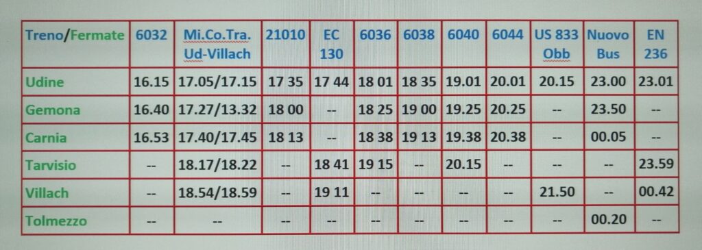In considerazione della possibilità di ridurre i tempi di percorrenza lungo la relazione Tricesimo-Carnia-Tarvisio proponiamo – come indicato nella sottostante tabella – di procedere ad una rivisitazione dell’orario attuale di alcune corse, migliorando in particolare il cadenzamento e alcune coincidenze a Udine con altri treni provenienti da Venezia/Pordenone, nonché l’inserimento di una corsa bus notturna verso le 23.00 per garantire in Alto Friuli il rientro dei passeggeri della Freccia 9756 (arrivo da Milano alle 22.37) e di Italo8920 (arrivo da Roma alle ore 22.17), nonché dare in generale la possibilità di un rientro serale in considerazione che attualmente l’ultimo treno è il R6044 delle ore 20.01.