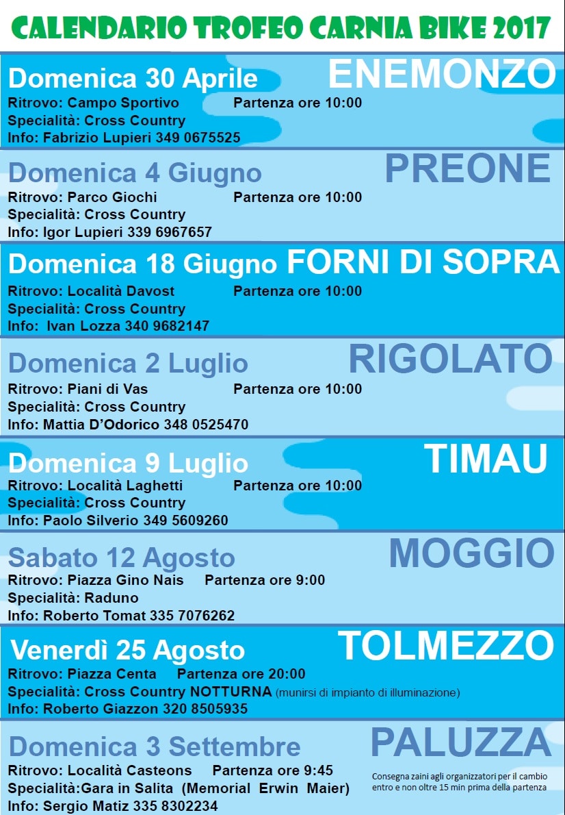 Tutte le info sulle gare, i percorsi, gli orari, il regolamento sono consultabili all’indirizzo www.carniabike.it/trofeocarniamtb.