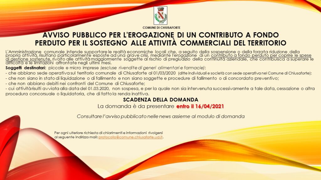 Il Comune di Chiusaforte ha emanato due avvisi pubblici a sostegno delle famiglie in difficoltà (scadenza presentazione domanda 31 marzo) e delle attività economiche del territorio (scadenza 16 aprile).