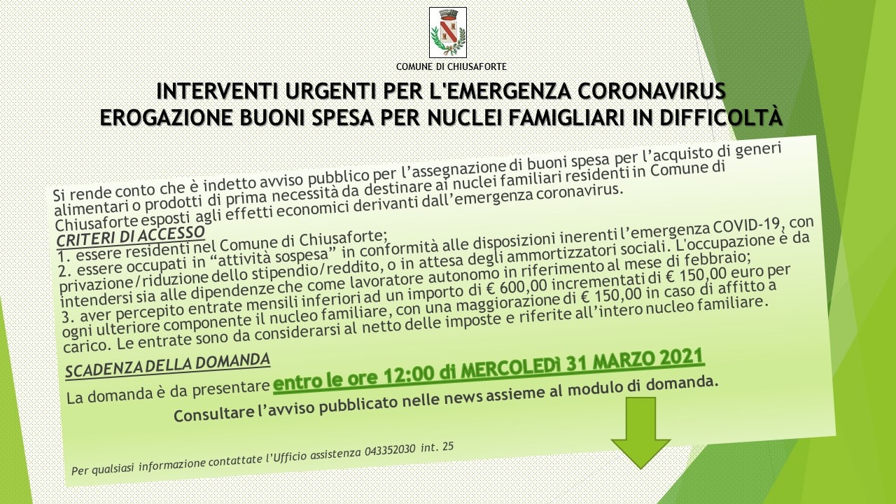 Il Comune di Chiusaforte ha emanato due avvisi pubblici a sostegno delle famiglie in difficoltà (scadenza presentazione domanda 31 marzo) e delle attività economiche del territorio (scadenza 16 aprile).