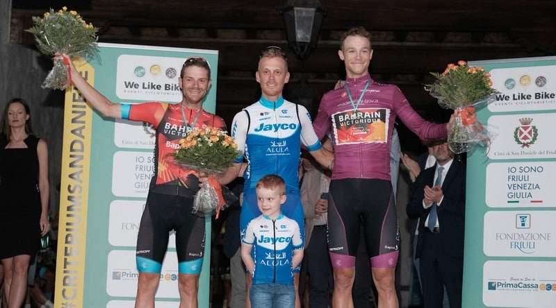 Sull’anello cittadino di San Daniele il gruppo che contava 28 atleti delle formazioni World Tour, Professional e Continental, ha regalato grande spettacolo con diversi tentativi di fuga che si sono succeduti senza soluzione di continuità. Nel finale da segnalare l’assolo del campione italiano Filippo Zana, a cui hanno risposto il siciliano Damiano Caruso e il “Rosso di Buja” Alessandro De Marchi. Proprio questi due hanno trovato l’accordo vincente per involarsi verso il traguardo: sulla rampa d’arrivo l’allungo vincente del portacolori della Jayco Alula che è andato così a prendersi un bellissimo successo davanti al proprio pubblico che lo ha acclamato a gran voce. Alle spalle dei due battistrada, ci ha pensato Jonathan Milan, maglia ciclamino al Giro d’Italia, a regolare allo sprint il gruppo inseguitore.