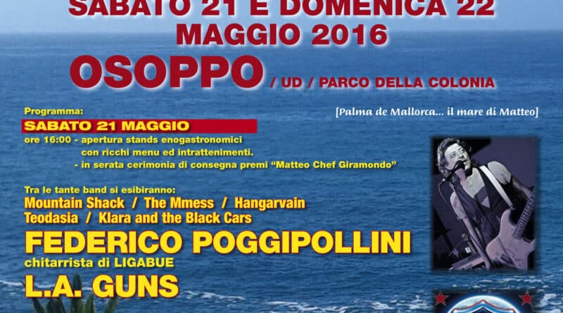 Cosa hanno in comune uno dei più grandi e storici gruppi di glam rock, il chitarrista di Ligabue e la sigla di Heidi, il cartone animato che ricorda l’infanzia a tanti di noi? Semplice, il concertone più fantasioso e trasversale che c’è: “Concerto per Matteo 2016”, manifestazione benefica che per il secondo anno consecutivo si terrà ad Osoppo nel Parco della Colonia sabato 21 e domenica 22 Maggio 2016.
