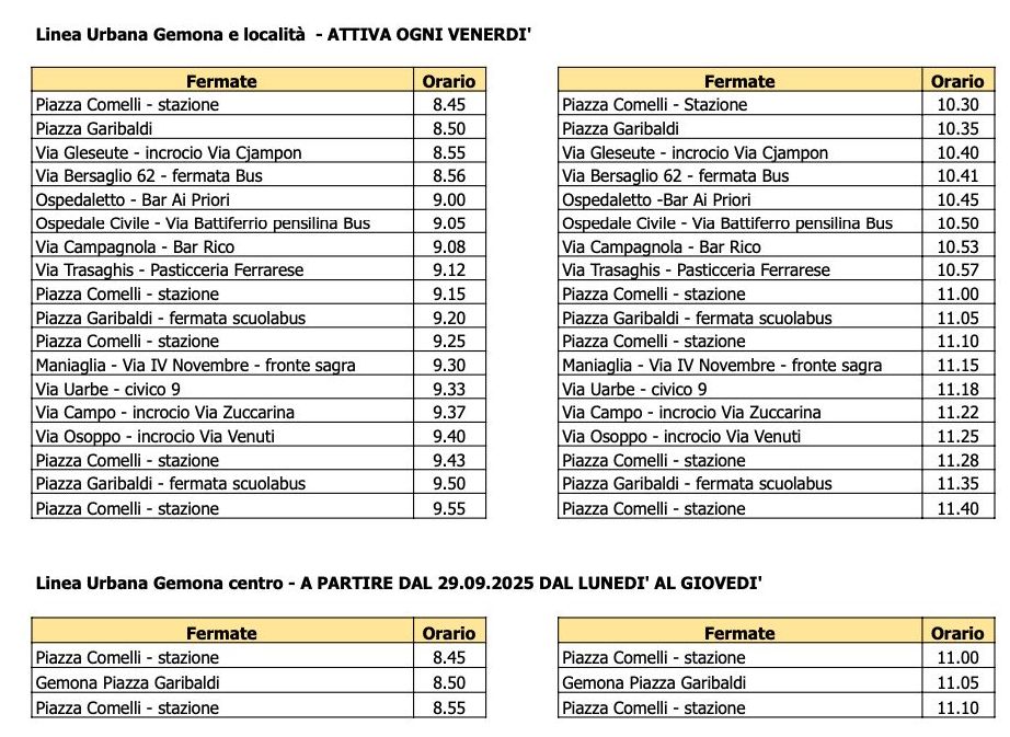 Il Comune di Gemona del Friuli ha attivato, in forma sperimentale, due nuove tratte urbane gratuite, pensate per migliorare la mobilità e favorire i collegamenti tra la stazione ferroviaria e il centro cittadino.