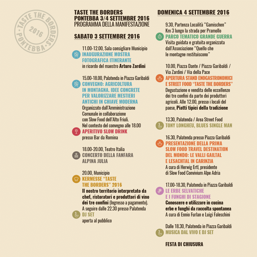 Due ricche giornate a Pontebba in occasione di “Taste the Borders“, che fra sabato 3 e domenica 4 settembre prevede una lunga serie di appuntanenti dedicati alla fotografia, all’agricoltura, alla montagna, alla musica, all’enogastronomia e tanto altro ancora.