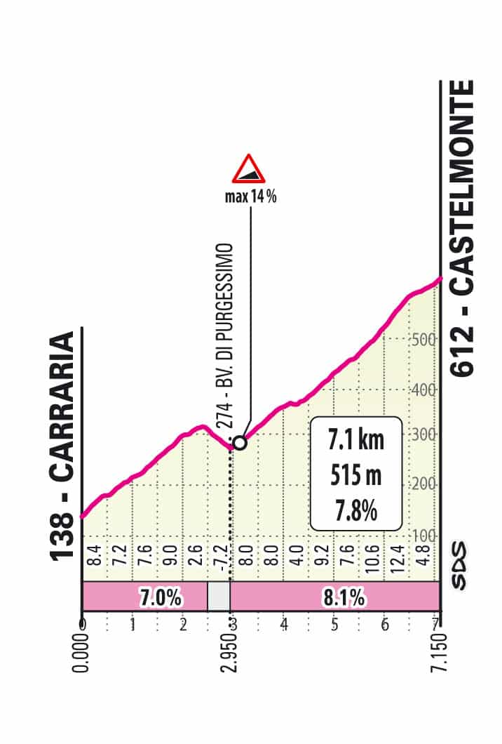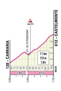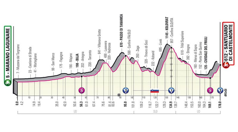 Inizia lì una delle salite inedite del Giro 2022: il Monte Kolovrat, 10 km praticamente al 10% (la pendenza si abbassa per un piccolo pianerottolo a metà salita).