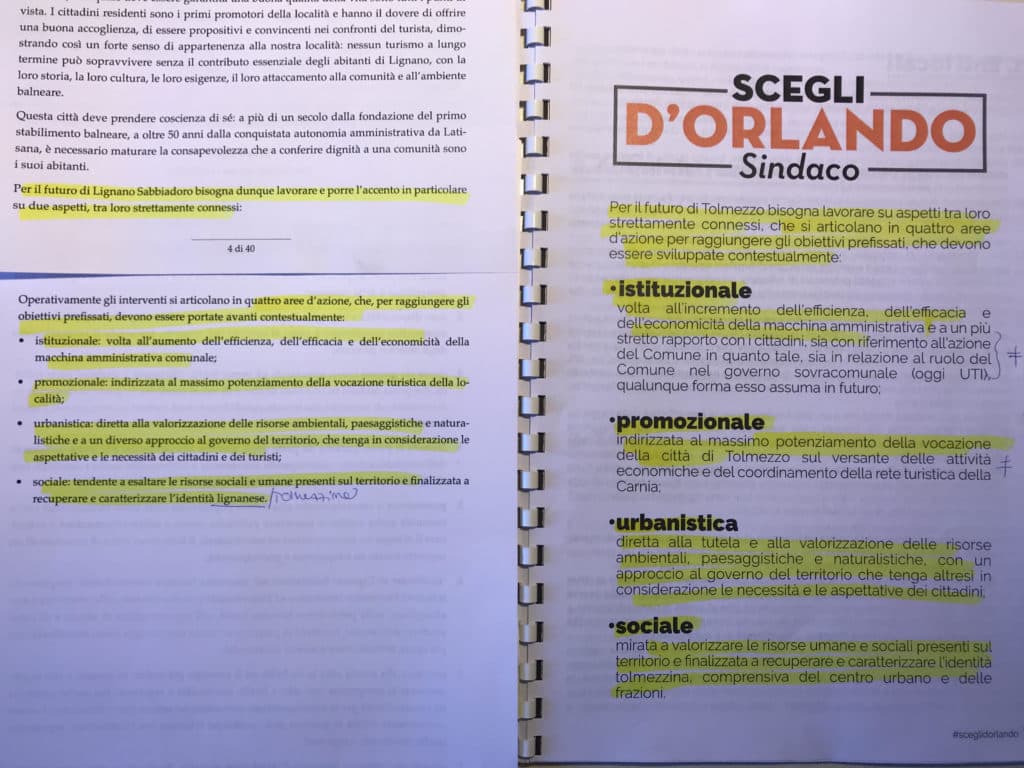 È con un certo imbarazzo che siamo venuti a conoscenza del fatto che diverse parti del programma della candidata sindaco di Tolmezzo Laura D’Orlando siano identiche, con quella che pare una vera e propria operazione di “copia e incolla”, al programma 2012 dell’allora candidato sindaco di Lignano Luca Fanotto.