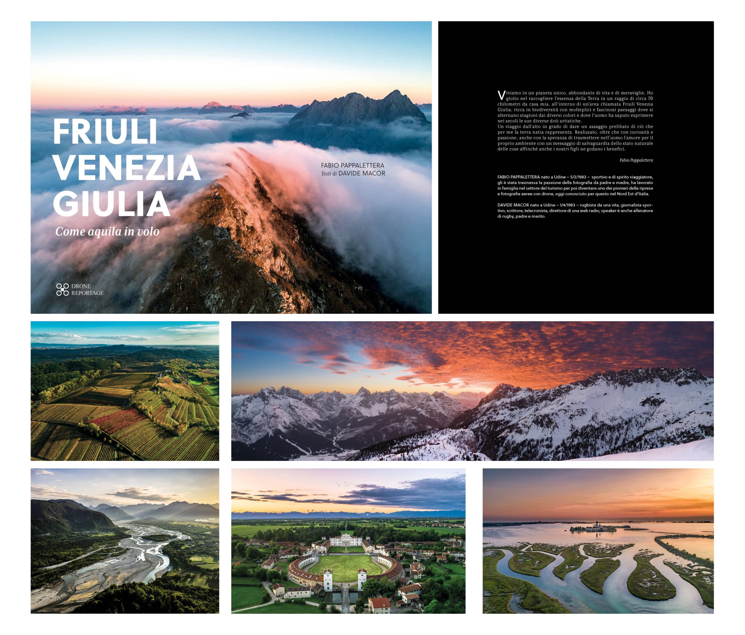 “Friuli Venezia Giulia – Come aquila in volo” è il primo libro del fotografo e dronista Fabio Pappalettera. Raccoglie in 236 pagine il meglio della nostra regione da un punto di vista assolutamente diverso e coinvolgente, ossia dall’occhio attento di un drone. Il viaggio fotografico spazia su tutto il territorio regionale, andando ad immortalare alcune delle eccellenze del Friuli Venezia Giulia: dalle montagne, scende lungo i fiumi, per andare a perdersi lungo le coste, senza dimenticare di immortalare borghi e città.