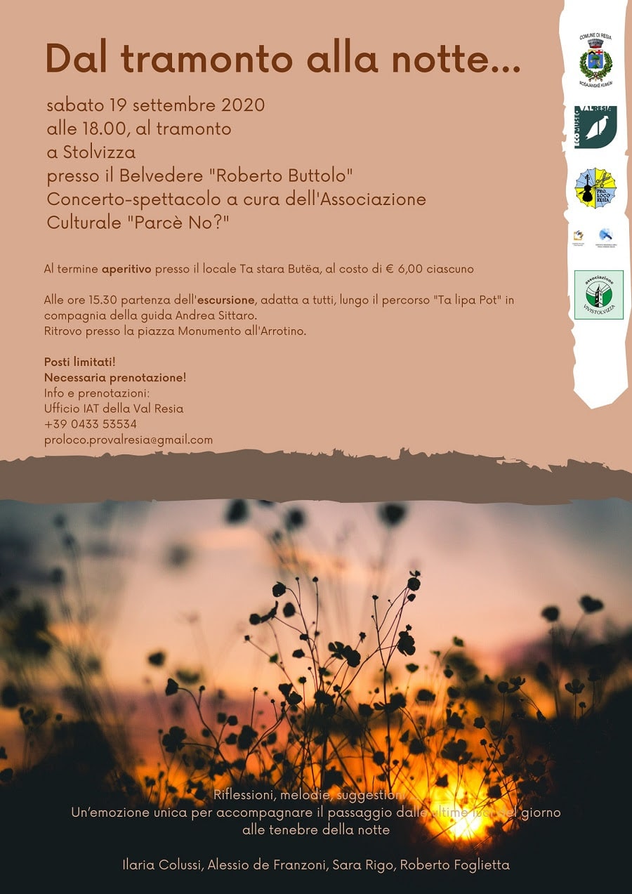 La Pro Val Resia e l’Ecomuseo Val Resia, organizzano per sabato 19 settembre alle ore 15.30 a Stolvizza un’escursione sul sentiero “Ta lipa pot” con la guida Andrea Sittaro e alle ore 18.00, presso il Belvedere “Roberto Buttolo”, il concerto spettacolo “Dal tramonto alla notte…”, a cura dell’Associazione Culturale “Parcè no?”.