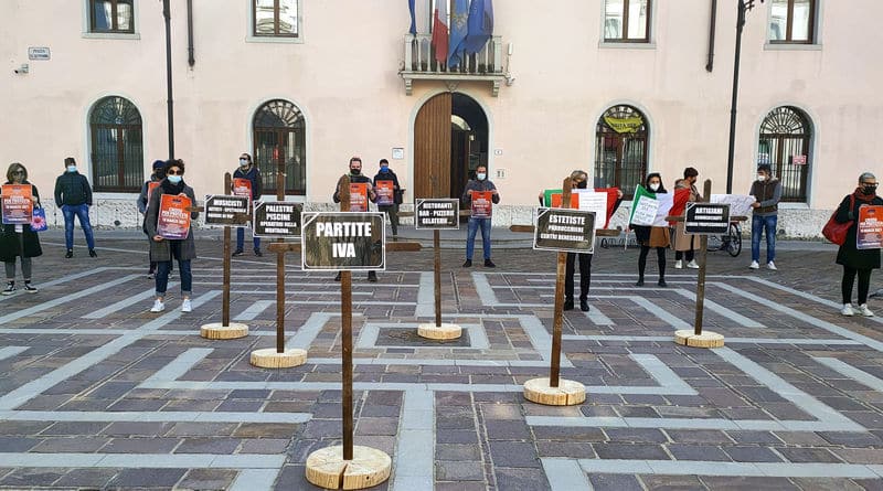 Molte serrande di Tolmezzo e della Carnia sono abbassate (le chiusure complessivamente dovrebbero essere 117) e in piazza XX Settembre sono state posizionate delle simboliche croci nelle quali sono riportate alcune delle categorie e attività che stanno soffrendo di più da un anno a questa parte (“Dopo un anno siamo ancora qui… A cosa sono servite le nostre chiusure?”, si legge in un cartello), ovvero musicisti, artisti, mondo dello spettacolo, agenzie viaggi, palestre, piscine, operatori della montagna, ritoranti, bar, gelaterie, pizzerie, estetiste, parrucchieri, centri benessere, artigiani, commercianti, liberi professionisti.