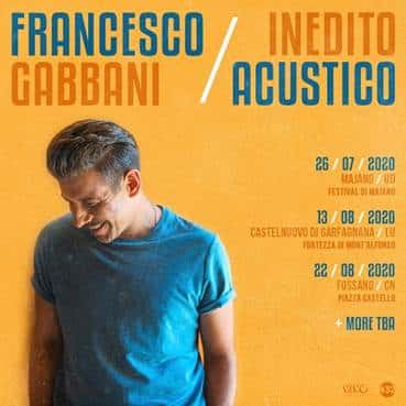 Francesco Gabbani torna live con un tour che ha fortemente voluto, per lanciare un segnale di speranza per un settore – quello dello spettacolo – in profonda sofferenza in questo periodo così difficile. Con “Inedito Acustico” l’artista porterà in scena uno spettacolo con cui racconterà il suo percorso artistico attraverso le canzoni e un dialogo con la voce della coscienza, che lo accompagnerà nella narrazione della storia dell’amico Fritz, suo alter ego. Tra musica, racconti ed emozioni Gabbani, accompagnato dalla sua band composta  da Filippo Gabbani (Batteria), Lorenzo Bertelloni (tastiere), Giacomo Spagnoli (basso) e Davide Cipollini (chitarra), presenterà i suoi primi brani, i successi sanremesi, le canzoni che hanno emozionato e fatto ballare tutti quanti, fino all’ultimo singolo “Il sudore ci appiccica”, in tutte le radio da quasi un mese. Francesco Gabbani ha raggiunto il successo vincendo due volte consecutive il Festival di Sanremo, primo cantante nella storia a riuscirci. Con la sua “Amen” vince nel 2016 nelle nuove proposte mentre con la super hit “Occidentali’s Karma” trionfa nella sezione Big nel 2017. A gennaio scorso ha pubblicato “Viceversa”, dal quale è estratto il singolo omonimo con cui Gabbani si è classificato al secondo posto della 68° edizione del Festival di Sanremo. Nonostante la sua giovane età ha collezionato una lunga serie di premi e riconoscimenti e tenuto decine di concerti sold out in tutta Italia.