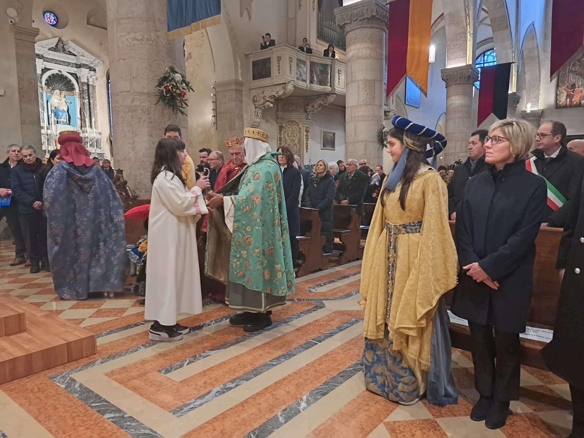 Altri passaggi significativi sono stati l’arrivo dei Magi, il bacio della pace con la venerazione di una raffigurazione quattrocentesca dell’Incoronazione della Vergine, opera preziosa della bottega orafa di Nicolò Lionello.
