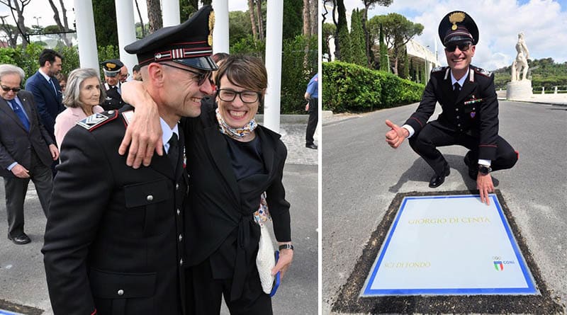 Su Di Centa, Malagò ha sottolineato: “È fratello d’arte (Manuela, che ha già la sua mattonella, era presente alla cerimonia, ndr) e papà d’arte (la figlia Martina è azzurra del fondo, ndr). Il suo oro olimpico nella 50 km di sci di fondo a Torino 2006 è un’impresa epica scolpita ora nella pietra”.