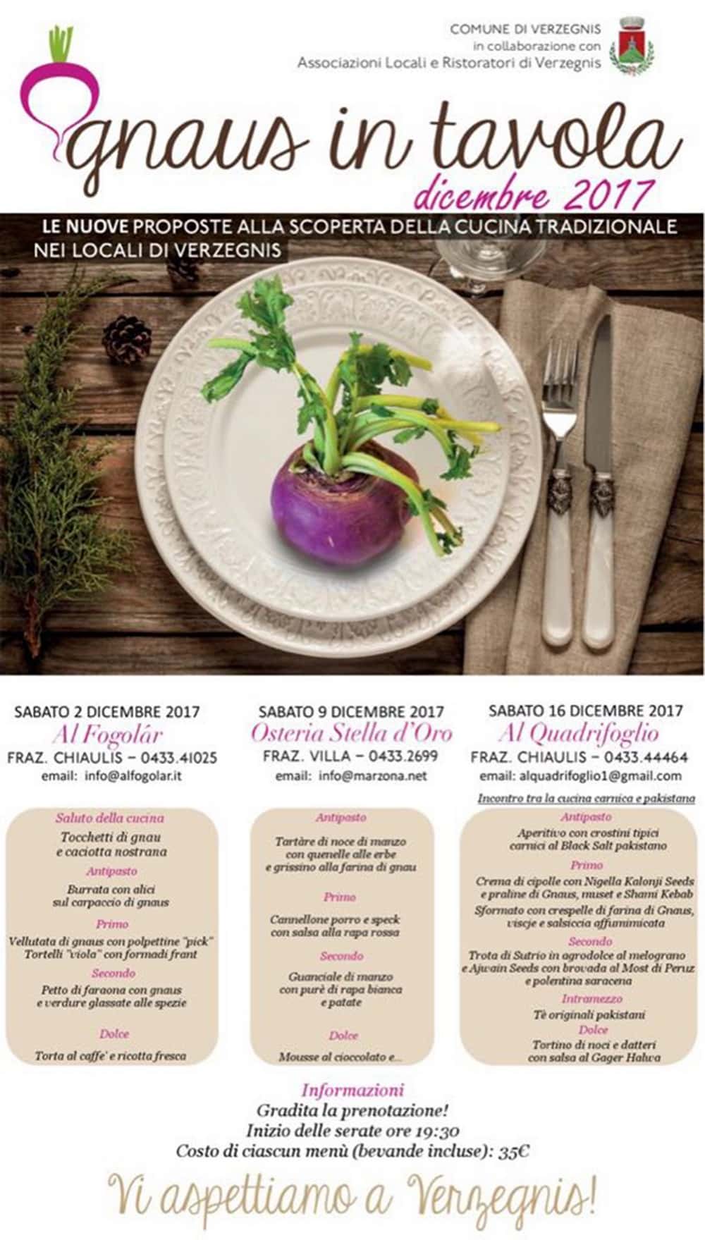 L’Amministrazione Comunale di Verzegnis, in collaborazione con le associazioni e i ristoratori del posto, propone un percorso culinario specifico con tre serate a tema, a partire da sabato 2 dicembre, organizzate nei ristoranti locali in cui il “gnau” è protagonista assoluto, sia per le sue curiosità che per il gusto che esso racchiude. Il tutto con l’aiuto di chi lo coltiva e di esperti del settore.