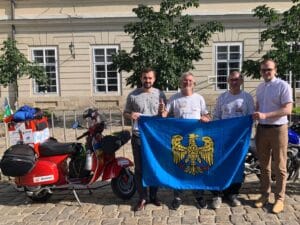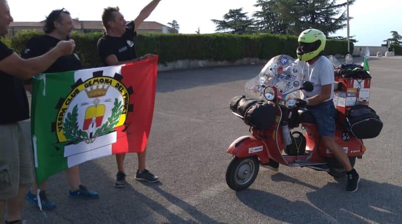 I “Cavalieri in Vespa”, Denis Ciani ed Edi Fadelli, sono rientrati in Friuli dopo un viaggio durato un mese, percorrendo più di 6 mila chilometri in sella alle loro Vespa Px 200 e attraversando 12 Paesi. Dopo aver conquistato Capo Nord, le isole Canarie e l’Islanda, i due vespisti friulani, portacolori dei Vespa Club Gemona e Aviano, entrando in Ucraina sono riusciti a completare la loro impresa, e cioè toccare i quattro punti cardinali d’Europa viaggiando sulle due ruote. Al loro rientro, ad accoglierli a Villa De Brandis, a San Giovanni al Natisone, c’erano i rappresentanti di 12 Vespa Club oltre ad amici e parenti. Una festa resa unica dallo spettacolo dei Trigeminus.