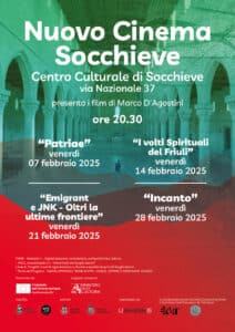 Il calendario propone “Patriae” il 7 febbraio, “I volti spirituali del Friuli” il 14, “Emigrant” e “JNK – Oltri la ultime frontiere” il 21, “Incanto” il 28. Tutti gli appuntamenti inizieranno alle 20.30. Alla prima proiezione sarà presente in sala lo sceneggiatore Luca De Clara, alle successive tre presenzierà lo stesso D’Agostini.