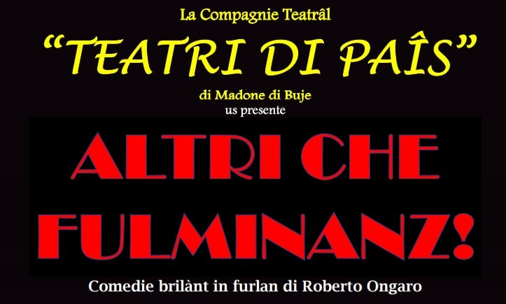Venerdì 13 novembre con inizio alle ore 20.45, presso il Centro Cultura Papa Luciani località Caporiacco di Colloredo M.A, la compagnia “Teatri di paîs” di Buja presenta la commedia brillante in lingua friulana in due atti “Altri che fulminanz !” di Roberto Ongaro, con la regia di Domenico Costantini.