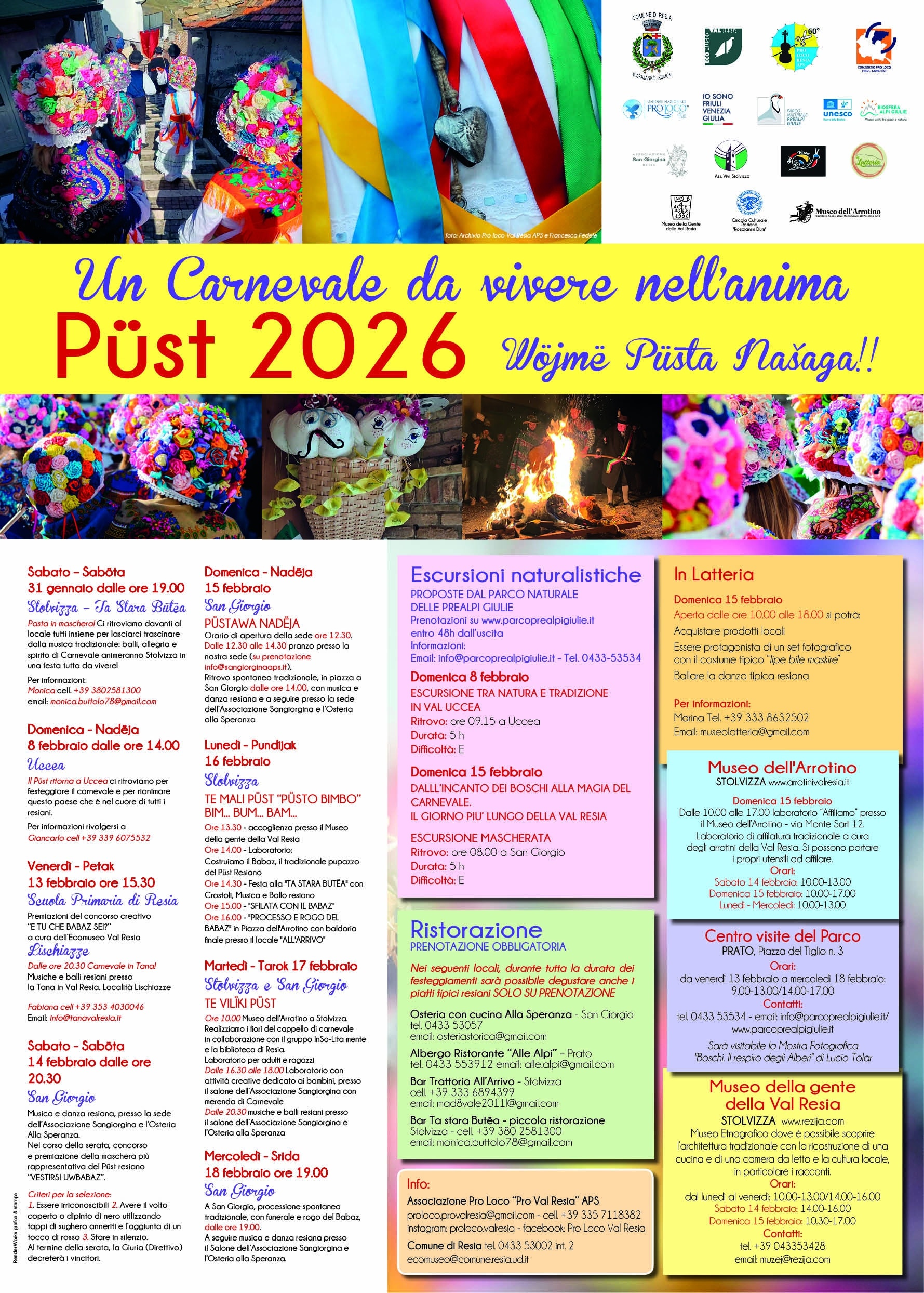 La Val Resia si appresta a vivere il Püst, il Carnevale Resiano, uno degli appuntamenti più viscerali e identitari del territorio friulano. Quest’anno i festeggiamenti si snoderanno attraverso un fitto calendario di eventi che, partendo da sabato 31 gennaio a Stolvizza con la serata “Maschere in pasta”, culmineranno nelle intense giornate tra il 13 e il 18 febbraio. Non si tratta di una semplice ricorrenza ludica, ma di un rito collettivo che intreccia natura, musica e antichi costumi, capace di coinvolgere ogni borgo della valle.