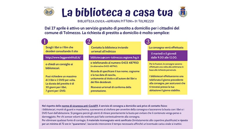 Considerato il protrarsi della chiusura al pubblico della biblioteca civica “Adriana Pittoni”, il Comune di Tolmezzo ha deciso di avviare un servizio di prestito libri e DVD a domicilio per i propri cittadini.
