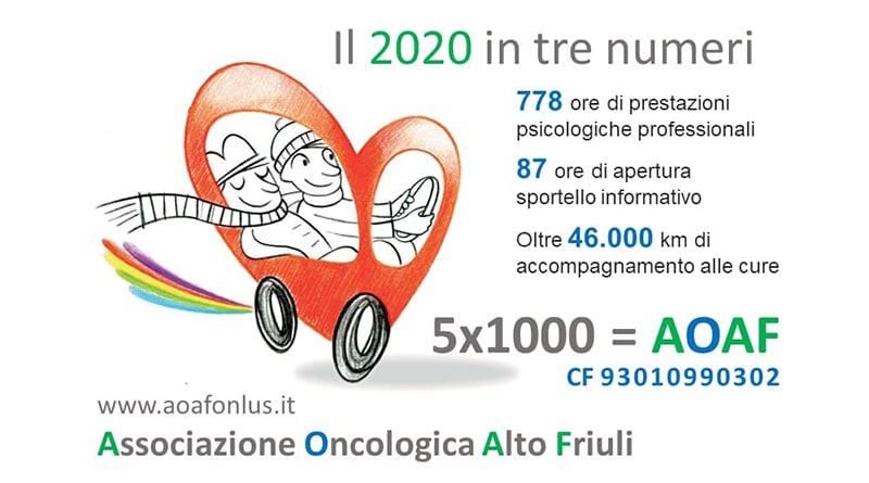 “Poter raggiungere l’ospedale per le visite e le cure, sentirsi sostenuti nell’impatto emotivo e psicologico che il percorso di cura comporta per se stessi e per i propri cari, essere ascoltati, esprimere le paure e i disagi legati alla malattia oncologica e acuiti dalla pandemia, sono passaggi essenziali che hanno un impatto diretto sulla vita delle persone – scrive l’AOAF nelle sua pagina Facebook -. Vicinanza che l’AOAF è riuscita ad offrire grazie alla sensibilità di quanti ci hanno sostenuto con offerte liberali e in particolare con la firma del 5 per mille: una firma che non grava sul contribuente ma significa tantissimo per le piccole associazioni come la nostra. Grazie di cuore a quanti ci aiuteranno a continuare il nostro impegno per migliorare la qualità della vita dei malati oncologici e in cure palliative nel territorio dell’Alto Friuli”.