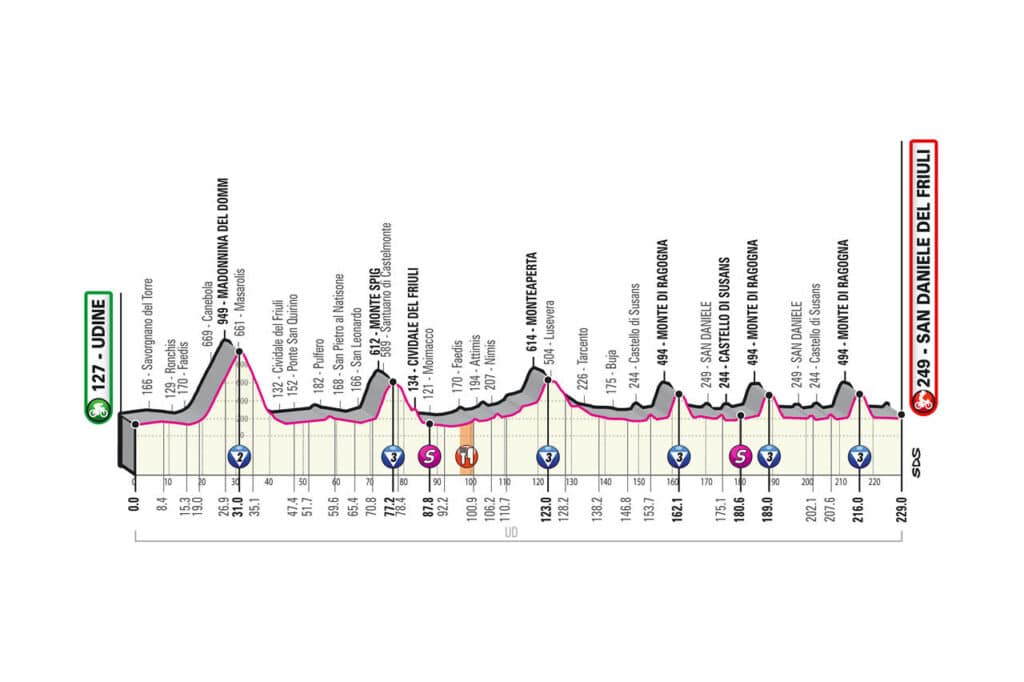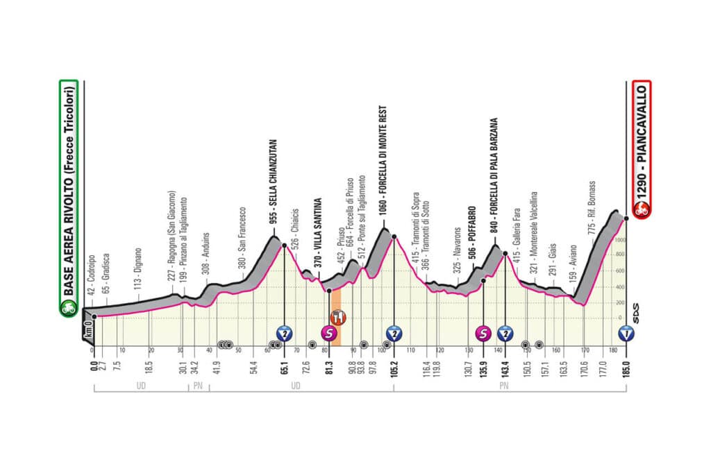 Le tappe del Giro – le numero 15 e 16 – saranno intervallate da una giornata di riposo. La prima, da Rivolto a Piancavallo, avrà una lunghezza di 183 chilometri; la seconda (martedì 20 ottobre) partirà da Udine per arrivare a San Daniele al termine di un percorso di 228 chilometri che attraverserà gran parte del Friuli.