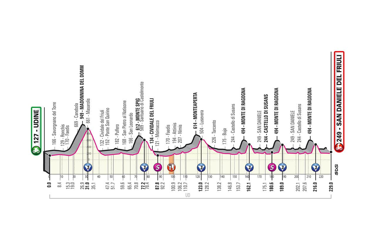 Le tappe del Giro – le numero 15 e 16 – saranno intervallate da una giornata di riposo. La prima, da Rivolto a Piancavallo, avrà una lunghezza di 183 chilometri; la seconda (martedì 20 ottobre) partirà da Udine per arrivare a San Daniele al termine di un percorso di 228 chilometri che attraverserà gran parte del Friuli.