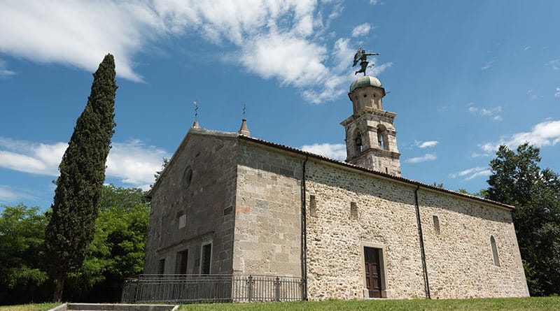 Il Colle di San Martino di Artegna è uno scrigno che comprende un patrimonio storico e artistico di grande interesse. L’elenco è lungo: castello, castrum longobardo, chiesa parrocchiale, torre campanaria, a cui va aggiunto un autentico gioiello: la Pieve di San Martino, che si eleva dal punto più elevato dell’altura. Riedificata dopo il devastante terremoto del 1511, la chiesa presenta una facciata in pietre squadrate e levigate che richiama motivi rinascimentali. Una parte dei muri laterali in pietrame è riconducibile al tardo medioevo, allo stesso periodo dovrebbe risalire la monofora gotica sul muro meridionale. Ma la vera sorpresa sta all’interno: sulle vele della volta, sulle pareti del presbiterio, nella navata sono conservati gli affreschi cinquecenteschi di Gian Paolo Thanner, friulano di origini bavaresi, pittore “senza scuola” e dal linguaggio popolareggiante. Stranamente, tra le numerose chiese friulane decorate dall’artista viene poco citata la Pieve di Artegna, che merita – eccome! – una visita.