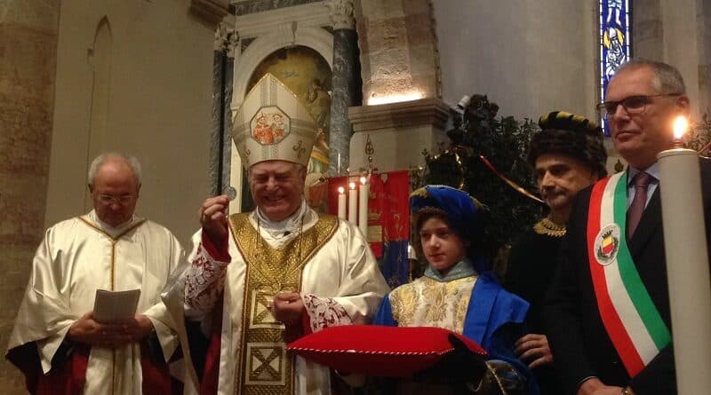 Una cerimonia quella andata in scena nella cittadina pedemontana che ha visto grande partecipazione di pubblico e cittadini, incominciata al mattino con il ritrovo sotto il loggione di Palazzo Boton e l’avvio del corteo aperto dalle delegazioni in costume storico giunte da Conegliano, Spilimbergo, Vicenza, Precenicco, Premariacco, Marano Lagunare, Strassoldo e Tricesimo. Quindi il sindaco Paolo Urbani, accompagnato dal Capitano del Popolo e dal paggetto con il Tallero d’argento, hanno fatto il loro ingresso in Duomo tra gli squilli delle trombe per poi attendere il momento più sentito, quello della consegna della moneta di Maria Teresa d’Austria, simbolo della rinnovata collaborazione tra Amministrazione comunale e Chiesa locale, rappresentata oltre che da Brollo anche dall’Arciprete Monsignor Valentino Costante.