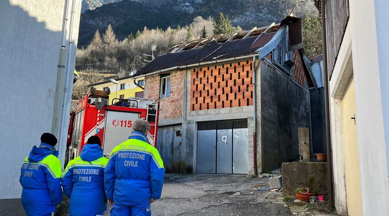 In corso le messe in sicurezza delle coperture da parte del gruppo di protezione civile di Arta Terme e dei Vigili del Fuoco.