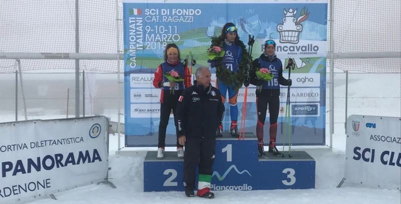 L’esponente dell’ASD Monte Coglians (comeliana trasferitasi a Forni Avoltri, nella foto sul podio) infatti giunta seconda nella gimkana sprint che a Piancavallo ha aperto gli Italiani Ragazzi di fondo, organizzati dallo Sci Club Panorama.