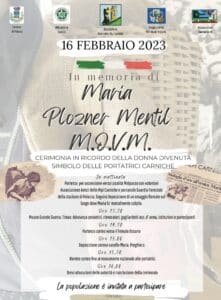 L’Associazione Amici delle Alpi Carniche, in capo al Museo della Grande Guerra di Timau, organizza per giovedì 16 febbraio una cerimonia in memoria e onore della donna divenuta simbolo delle Portatrici Carniche, Maria Plozner Mentil, Medaglia d’Oro al Valor Militare, la quale perse la vita proprio il 16 febbraio del lontano 1916.