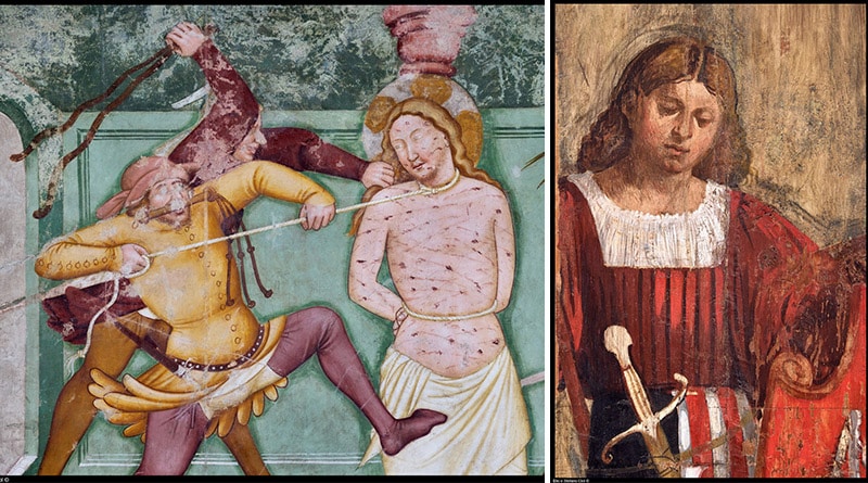 Gli occhi poi si soffermano meravigliati davanti all’immagine del coro ligneo, con annesso leggio, scolpito, intarsiato e dorato da Marco Cozzi nel 1475/1477, già in duomo e ora ospitato nella chiesa dei Santi Giuseppe e Pantaleone, popolarmente detta dei Frati. Ecco poi le foto delle portelle dell’organo, tempere su tela realizzate nel 1524 dal Pordenone. Esse rappresentano la Caduta di Simon Mago e la Conversione di Saulo (quando sono aperte) e l’Assunzione della Vergine (da chiuse). Affacciandosi alla trifora del salone si può godere di una vista privilegiata del duomo nella sua affascinante bellezza, col portale di Zenone da Campione, gli archetti romanico-gotici del sottotetto, la cappella di San Michele e il maestoso San Cristoforo, patrono di viandanti e pellegrini. A levante, appena a ridosso dell’abside, si scorge la chiesetta di Santa Cecilia, il più vetusto edificio di culto presente in città. Il visitatore, pur immerso in tanta meraviglia, non può non restare rapito di fronte alle immagini degli affreschi di scuola vitalesca che decorano l’abside del duomo. Essi rappresentano una delle testimonianze più significative della pittura del Trecento in Friuli.