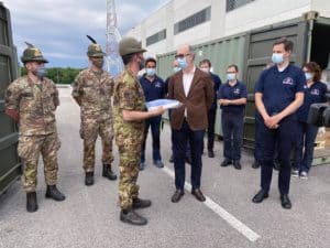 Il primo luglio dal porto di Livorno partiranno verso il medio oriente otto container; sette sono carichi di derrate alimentari che, una volta giunte sul posto, verranno distribuite a seconda delle esigenze della popolazione locale, mentre in un altro viaggeranno alcuni ventilatori polmonari portatili per gli ospedali della zona e numerosi dispositivi di protezione individuale con i quali far fronte all’emergenza coronavirus. Riccardi ha inoltre consegnato a Vezzoli una bandiera del Friuli Venezia Giulia che verrà issata al Camp Arena di Herat.