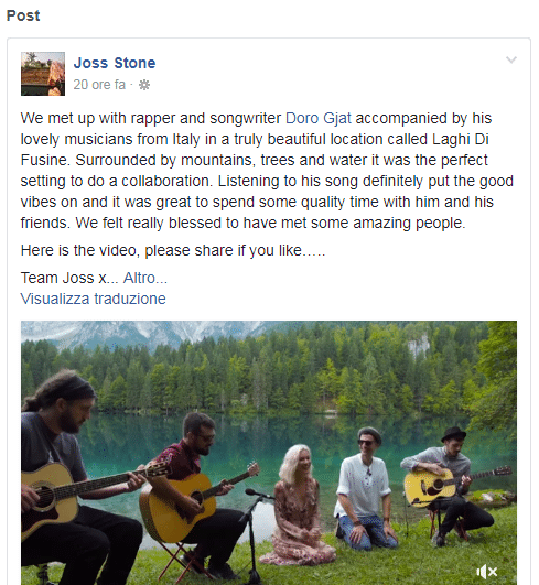 “Abbiamo incontrato il rapper e cantautore Doro Gjat accompagnati dai suoi musicisti italiani in una splendida località chiamata Laghi Di Fusine – ha scritto sul suo profilo Joss Stone – circondato da montagne, alberi e acqua, è stato il luogo ideale per fare una collaborazione. Ascoltare la sua canzone ha sicuramente trasmesso ottime vibrazioni e è stato bello trascorrere del tempo con lui e con i suoi amici. Ci siamo sentiti veramente fortunati ad aver incontrato persone incredibili. Ecco il video, ti invitiamo a condividere se ti piace …”