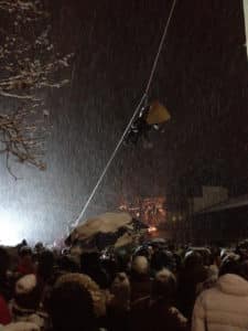 La suggestiva discesa della Befana, seduta a cavalcioni sulla scopa, avviene lungo una “teleferica in corde”, una manovra utilizzata dal Corpo Nazionale del Soccorso Alpino per attraversare forre e canyon. Due resistenti funi fanno da supporto al carico, mentre un’altra fune manovrata dai soccorritori, regolano il trasferimento dello stesso lungo il tragitto.
