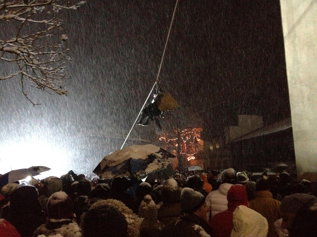 La suggestiva discesa della Befana, seduta a cavalcioni sulla scopa, avviene lungo una “teleferica in corde”, una manovra utilizzata dal Corpo Nazionale del Soccorso Alpino per attraversare forre e canyon. Due resistenti funi fanno da supporto al carico, mentre un’altra fune manovrata dai soccorritori, regolano il trasferimento dello stesso lungo il tragitto.