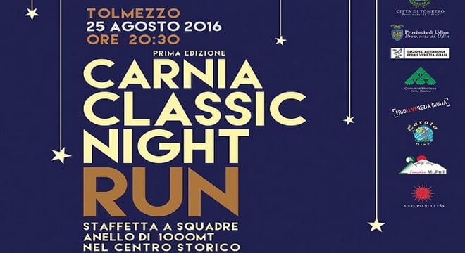 Giovedì 25 agosto alle 20.30 si svolgerà la prima edizione della Carnia Classic Night Run, staffetta podistica organizzata a Tolmezzo dall’ASD Piani di Vas in collaborazione con la Carniatletica, il tutto nell’ambito degli eventi collaterali della Carnia Classic Fuji-Zoncolan, la gran fondo ciclistica promossa dall’ASD Carnia Bike in programma domenica 28 agosto.