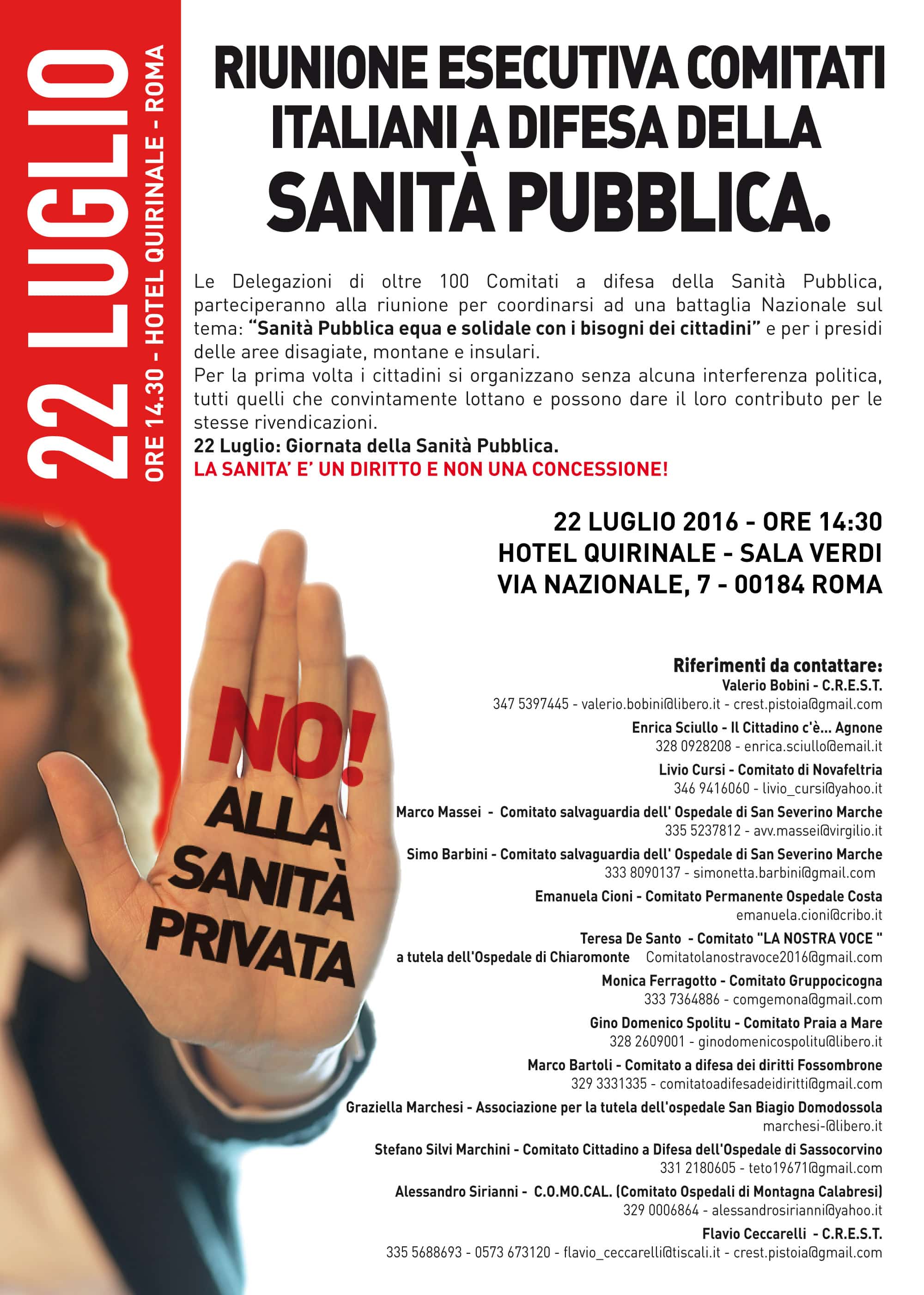 Sono circa 140, i rappresentanti di comitati e associazioni a difesa della sanità pubblica, che hanno dato la disponibilità a partecipare alla riunione per coordinarsi a livello nazionale sul tema “Sanità pubblica equa e solidale con i bisogni dei cittadini”. Da Gemona del Friuli a Procida in Campania, da Giarre in Sicilia a Bibbiena in Toscana, dalle Marche al Lazio, dall’Emilia Romagna alla Puglia e da tantissime altre località, in lotta per i propri ospedali e per una sanità pubblica più equa e rispondente alle necessità dei cittadini, per concordare ed attuare una “battaglia” comune.