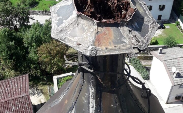 Sul posto è dapprima giunta una squadra del distaccamento di Gemona del Friuli e successivamente è sopraggiunta un’autoscala dalla sede centrale di Udine. Raggiunta la sommità gli operatori hanno dapprima valutato la situazione, verificando che effettivamente il punto di fissaggio del manufatto in ferro sulla sommità della guglia in legno non garantiva l’ancoraggio in quanto il legno era completamente marcio. A questo punto si è deciso di procedere con il taglio della croce a pezzi mediante l’utilizzo di una troncatrice a disco. I singoli spezzoni sono stati quindi adagiati sul cestello dell’autoscala e trasportati a terra. La guglia è stata quindi ricoperta con un telo flessibile per impedire infiltrazioni d’acqua.