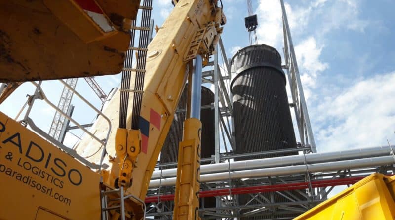 La gru telescopica più grande del mondo nei cantieri della Fantoni di Rivoli di Osoppo. Spettacolare la posa, in questi giorni di agosto, di due giganteschi elementi, di 120 tonnellate, alti 30 metri, che faranno parte di una maxi caldaia. Prodotti dalla Pelfa di Osoppo, sono stati trasportati sul luogo della posa dalla Autotir di Tarcento e le operazioni di posa sono state eseguite dalla Carpin Autogru di Scorzè con l’ausilio della ditta Paradiso di Canosa di Puglia, con la gru Liebherr Ltm da 1200 tonnellate, la gru telescopica più grande del mondo (nelle foto).
